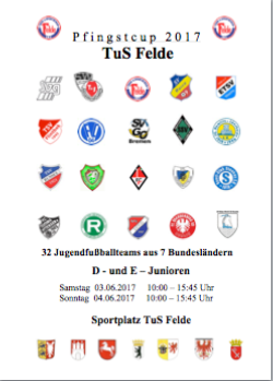 32 Mannschaften der Jahrgänge 2004/2005 (D-Jugend) und 2006/2007 (E-Jugend) aus 7 Bundesländern nehmen am Pfingstturnier des TuS Felde am 3. und 4. Juni 2017 teil. Von jeweils 10 bis 16 Uhr kämpfen die Kickerinnen und Kicker um Pokale und Sachpreise.
