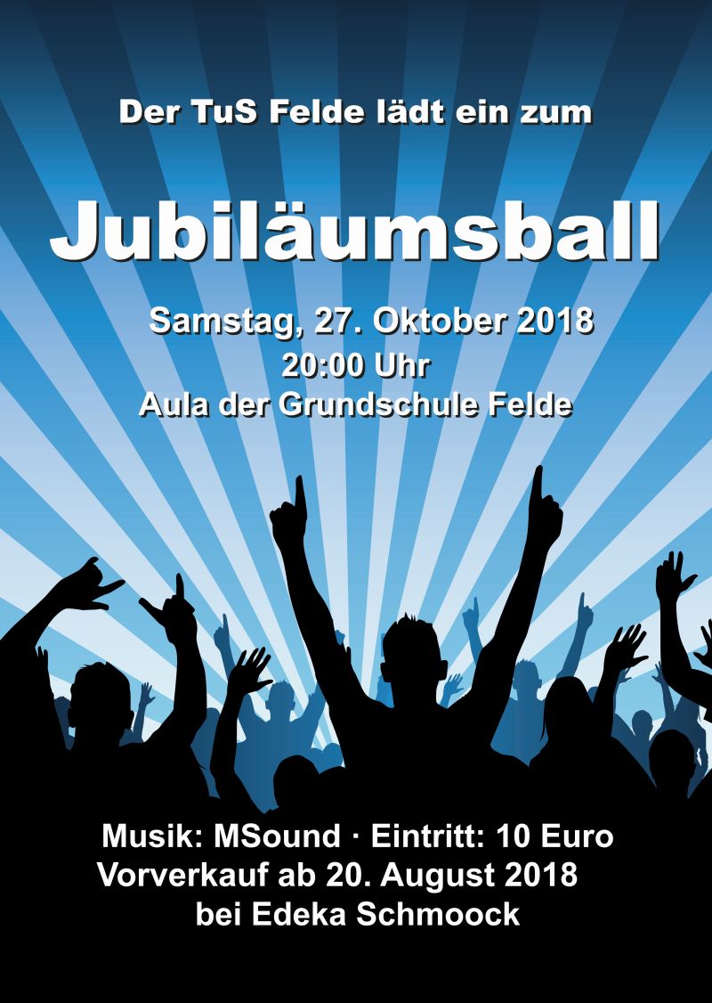 Jubiläumsball am 27.10.2018 Drucken E-Mail Der TuS Felde feiert über 90 Jahre organisierten Sport in Felde und lädt zum Jubiläumsball am 27.10.2018 ab 20:00 in die Aula der Grundschule Felde. Zurück Weiter